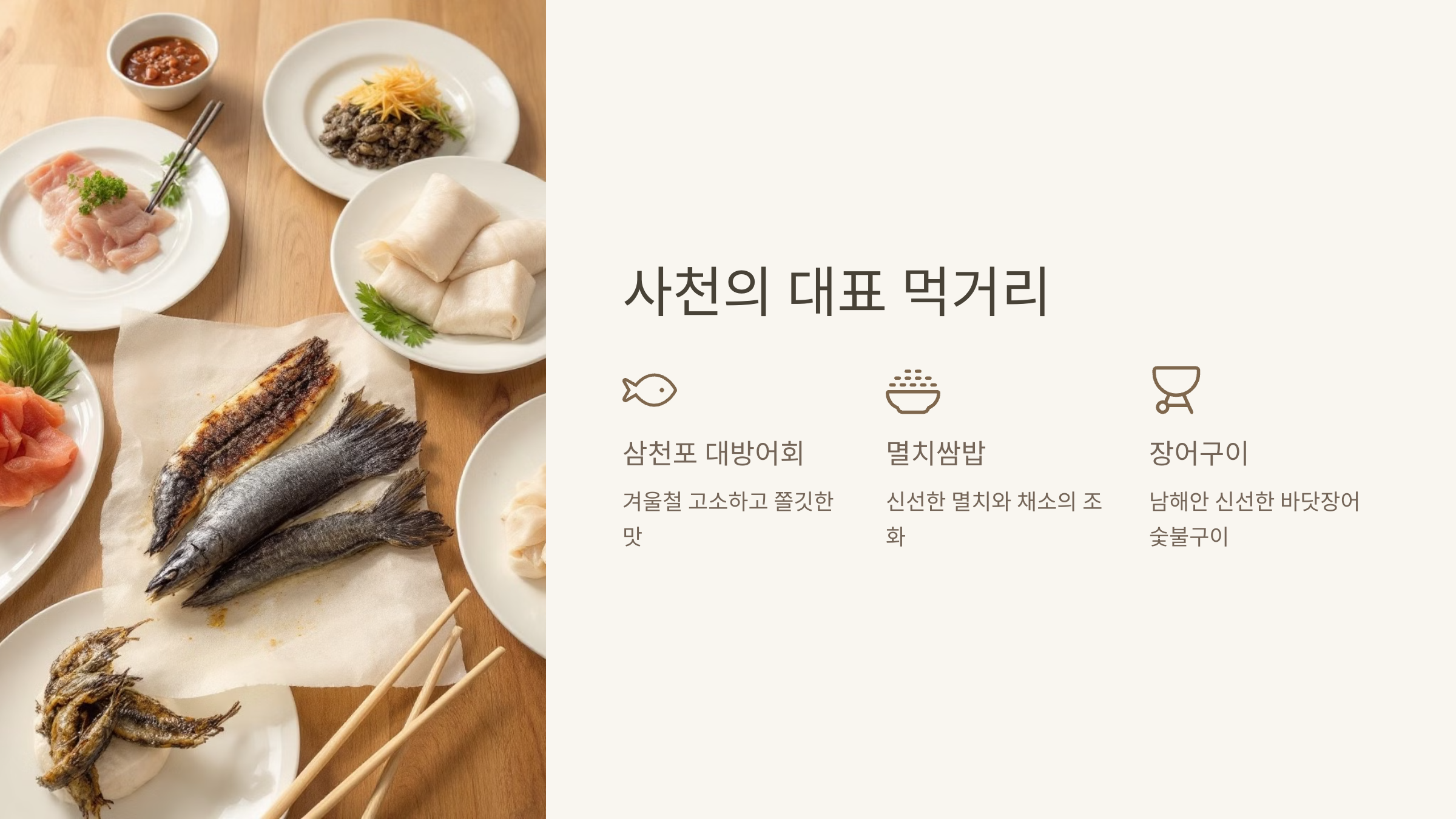 여행에서 빼놓을 수 없는 것이 바로 먹거리죠! 사천은 신선한 해산물이 유명한 곳인데요, 특히 이 지역에서 꼭 맛봐야 할 대표 음식들을 정리해 봤어요.