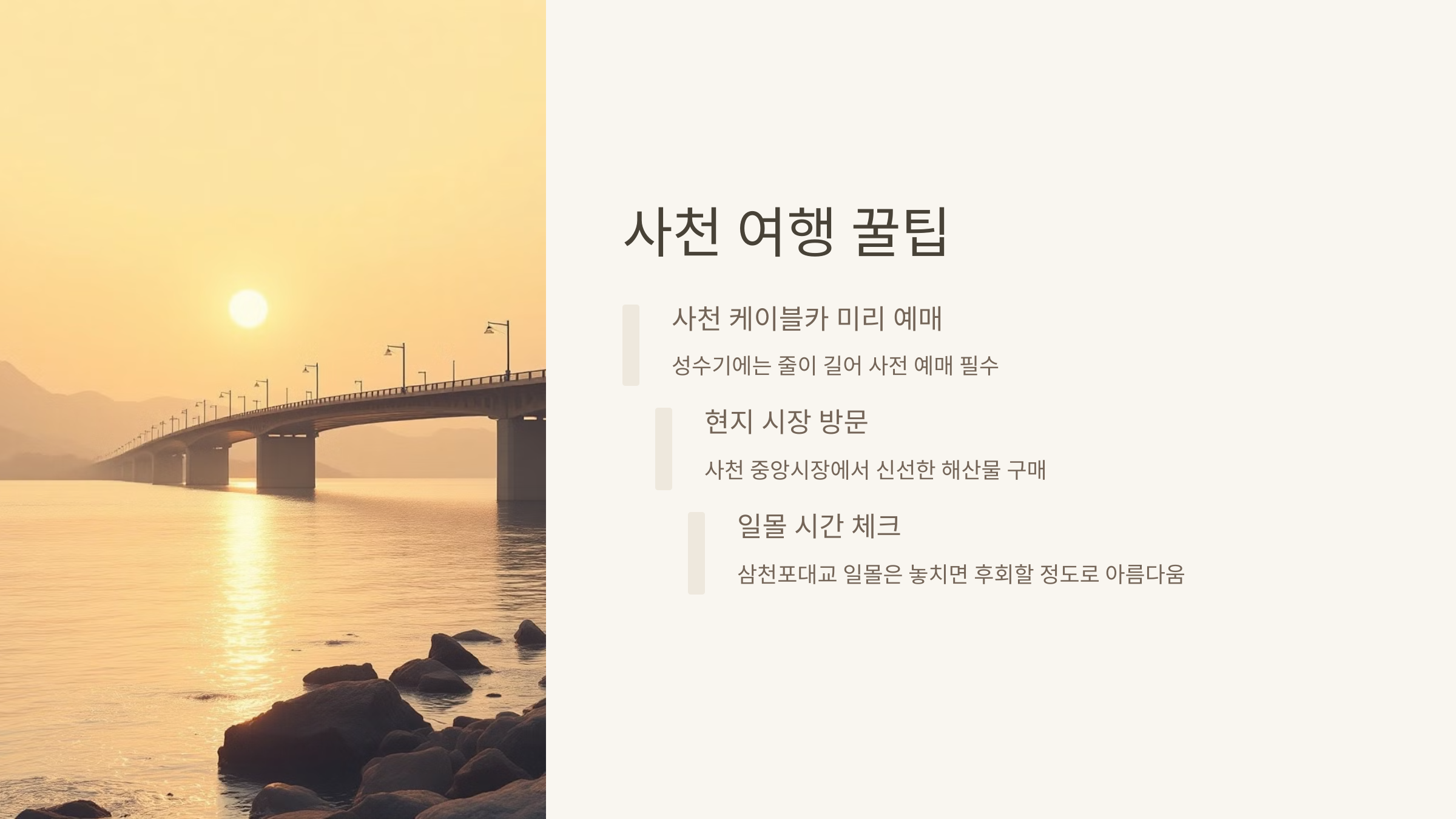 사천 여행을 더욱 알차게 즐기기 위한 몇 가지 꿀팁을 알려드릴게요. 이 정보를 알고 가면 더욱 편하고 즐거운 여행이 될 거예요.