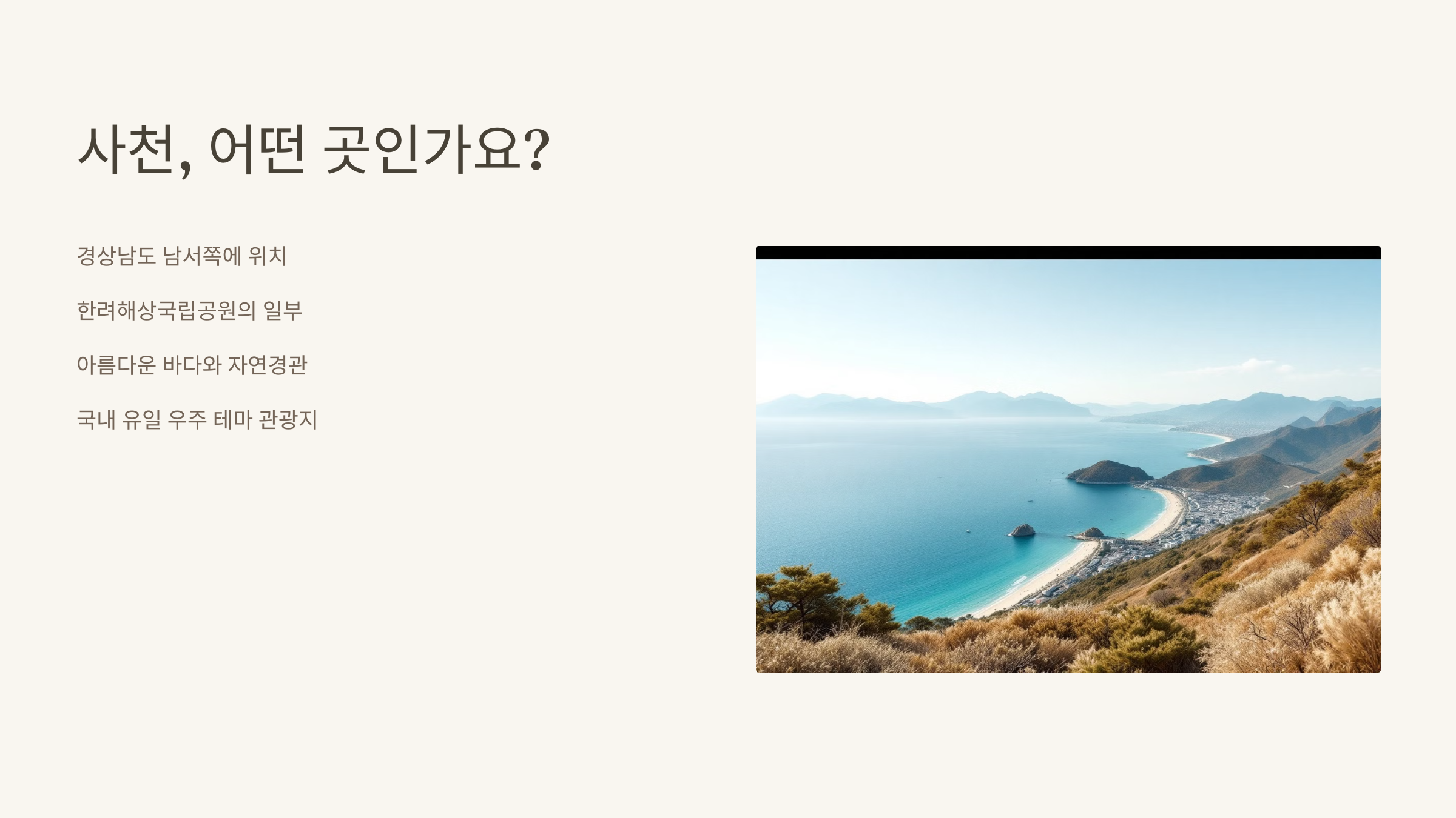안녕하세요, 여행을 사랑하는 여러분! 이번엔 가족과 함께 떠나기 좋은 국내 여행지 중 하나인 사천을 소개해드리려고 해요. 바다와 산이 조화를 이루는 이곳은 아이들과 함께하기에도, 부모님과 여유롭게 즐기기에도 최적의 장소랍니다. 저도 얼마 전 다녀왔는데, 다시 가고 싶을 정도로 매력적인 곳이었어요. 맛있는 해산물, 아름다운 일몰, 그리고 신나는 체험까지! 여러분께 꼭 추천하고 싶은 사천 여행 코스와 꿀팁을 정리해 봤어요. 함께 떠나볼까요?