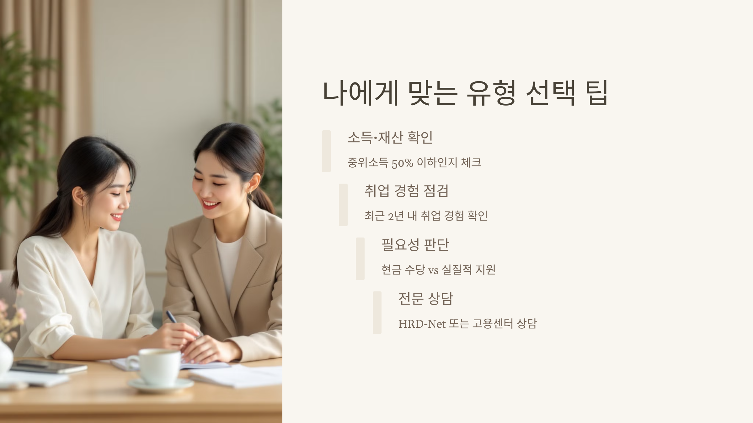따라서 신청 전에 가구 소득, 재산, 취업 상황 등을 꼼꼼히 따져야 해요. 단순히 나이가 맞는다고 되는 건 아니거든요. 실업 기간이나 전직 여부도 반영되기 때문에, 자신이 어느 유형에 더 적합한지 사전 진단이 필수입니다.