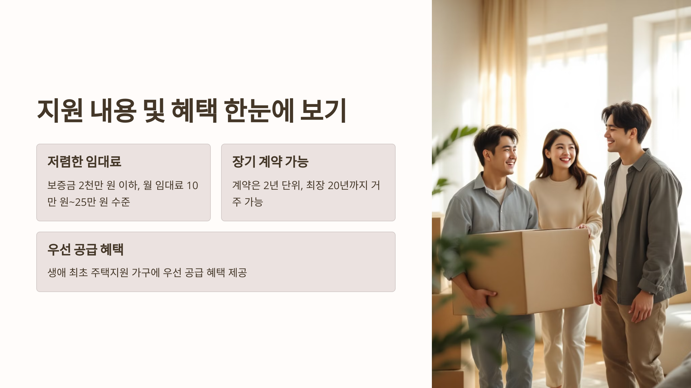 이번 지원은 단순한 임대가 아니라, 실질적으로 내 집처럼 안정된 주거 환경을 제공합니다. 저렴한 임대료는 물론, 계약 기간도 2년 단위로 최대 20년까지 연장 가능하니 장기적으로도 아주 유리하죠.