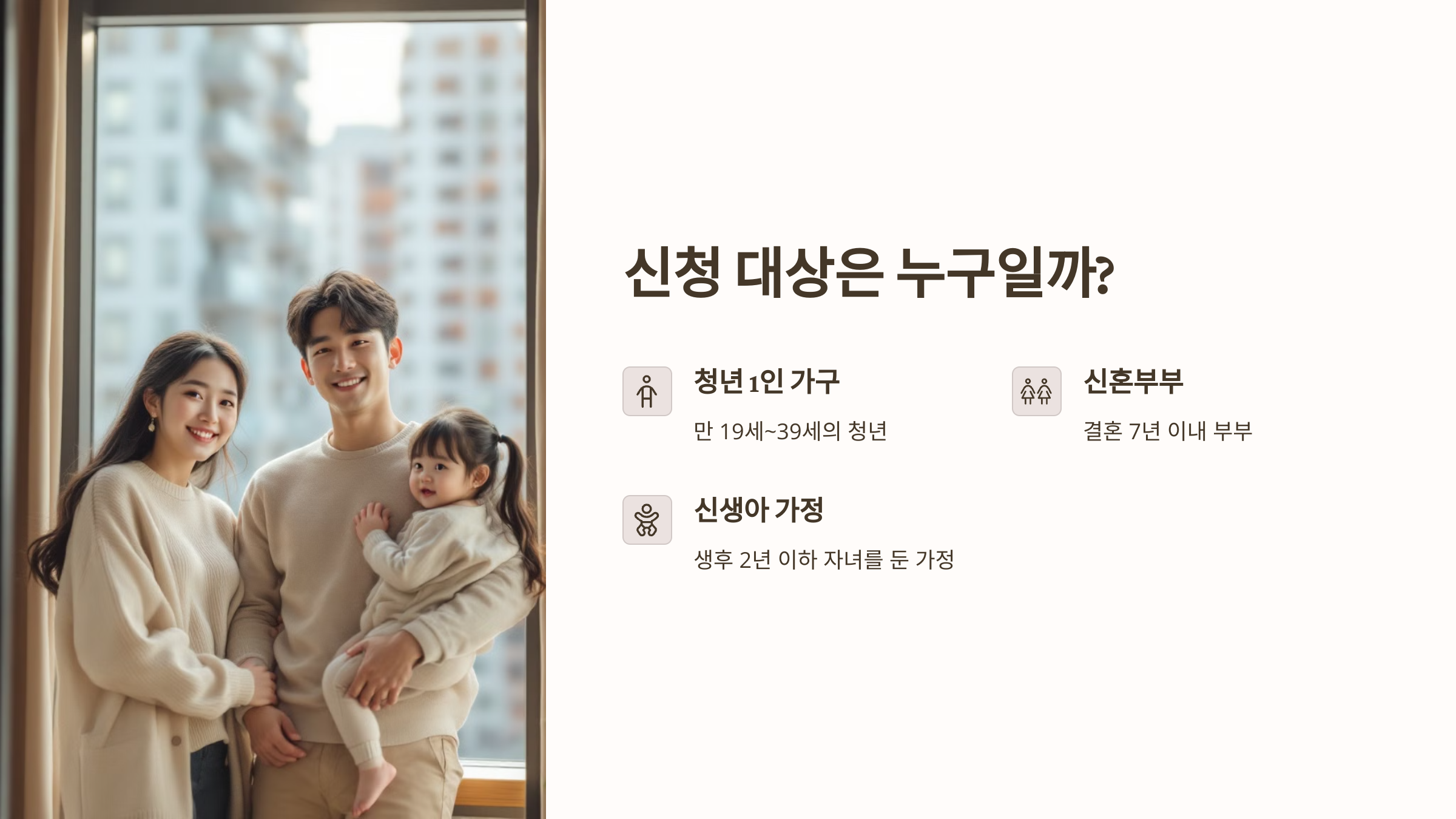 이번 매입임대주택은 주거비 부담이 큰 청년, 신혼부부, 그리고 신생아를 둔 가정을 위해 특별히 준비되었어요. 대상은 만 19세~39세의 청년 1인 가구, 결혼 7년 이내 신혼부부, 생후 2년 이하의 자녀를 둔 신생아 가정 등이 포함돼요. 특히 생애 최초 주택 지원을 받는 분들에게는 우선공급 혜택도 있다고 하니, 자격 조건만 맞는다면 꼭 한 번 신청해보시길 추천드려요!