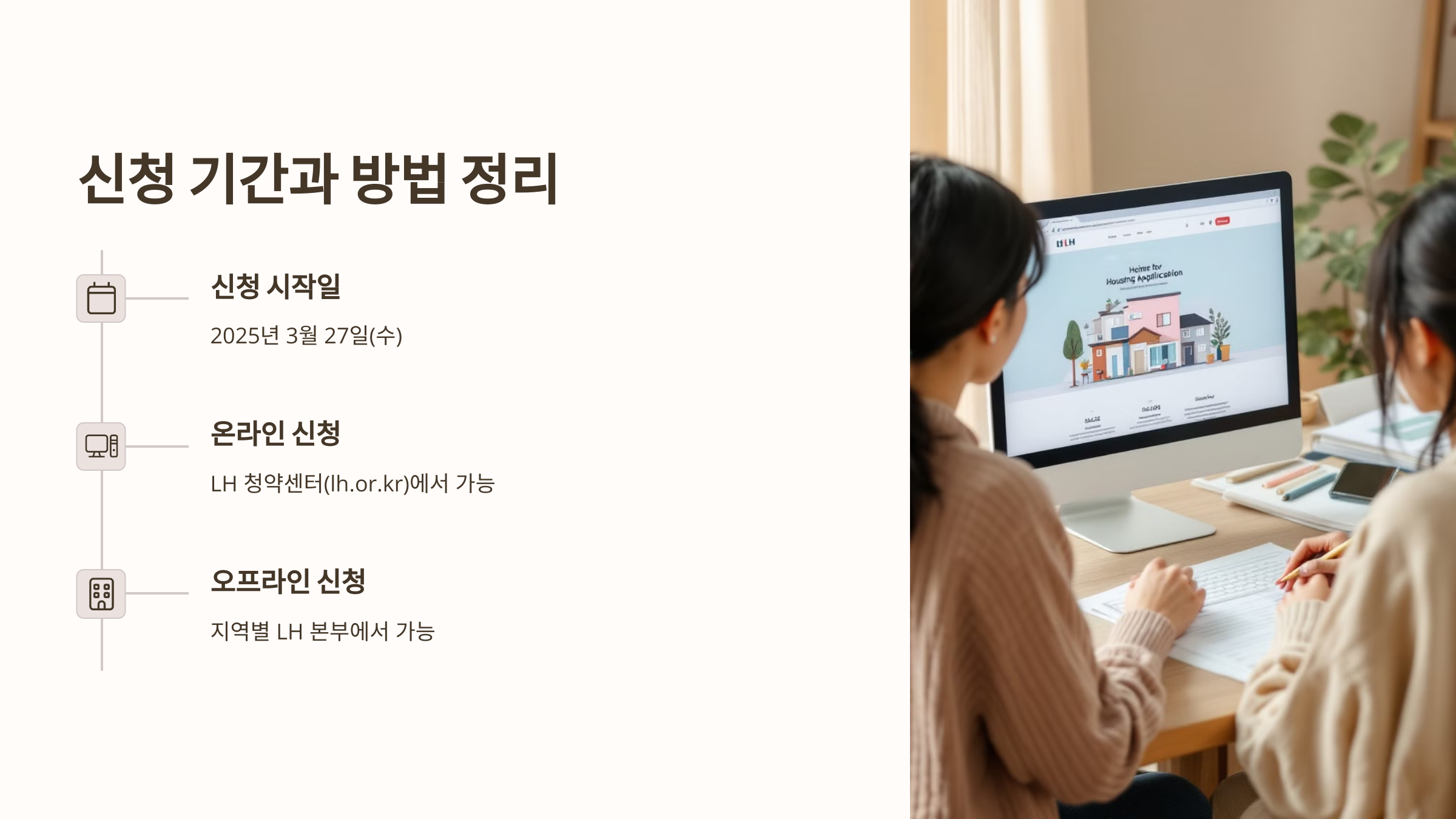 2025년 3월 27일부터 신청 접수가 시작됩니다! 온라인으로는 LH 청약센터(lh.or.kr)에서, 오프라인으로는 지역별 LH 본부에서 가능합니다. 신청 전에 미리 자격 요건을 꼼꼼히 확인하시고, 서류는 빠짐없이 준비해두세요.