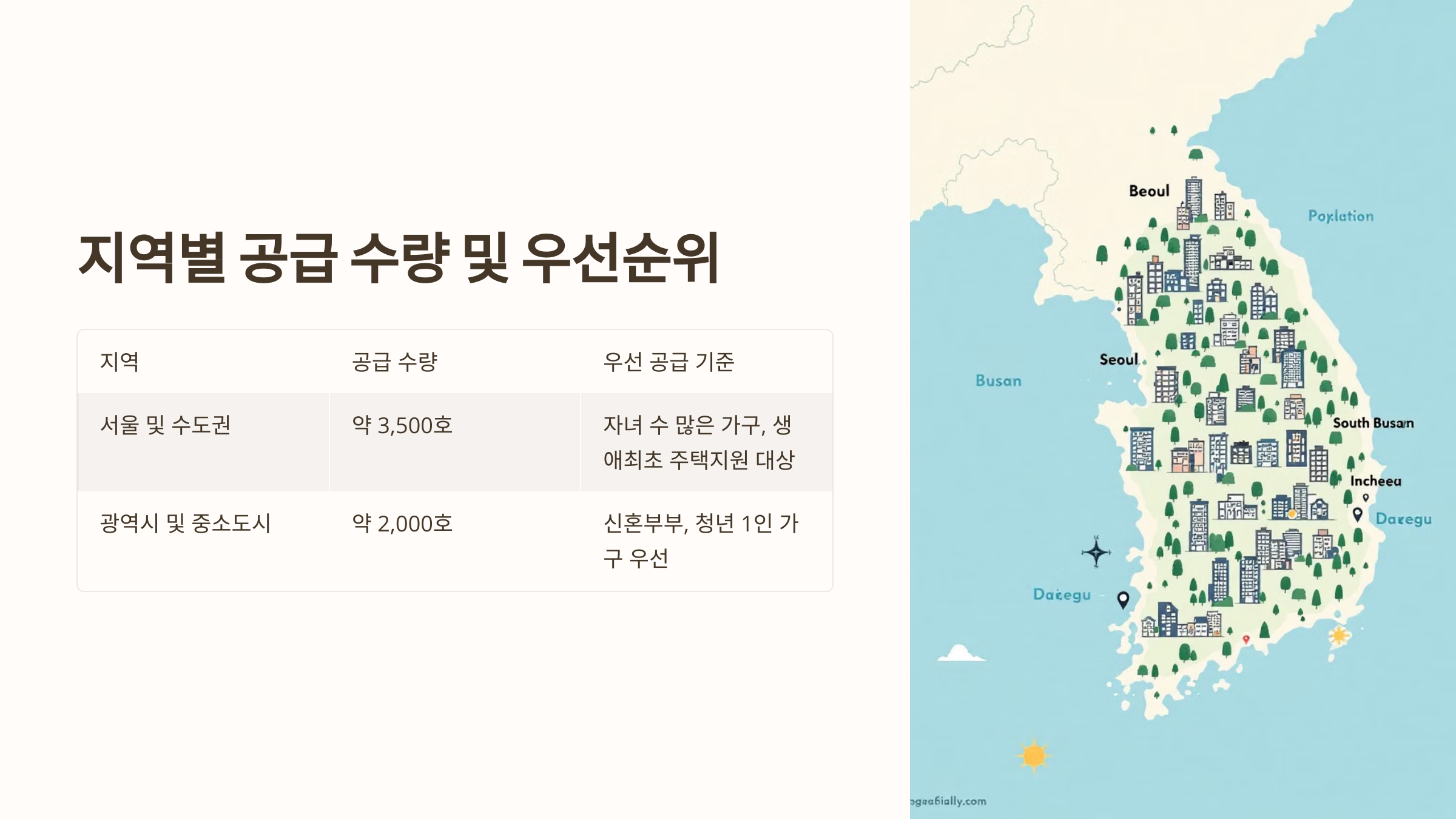 | 광역시 및 중소도시 | 약 2,000호 | 신혼부부, 청년 1인 가구 우선 |